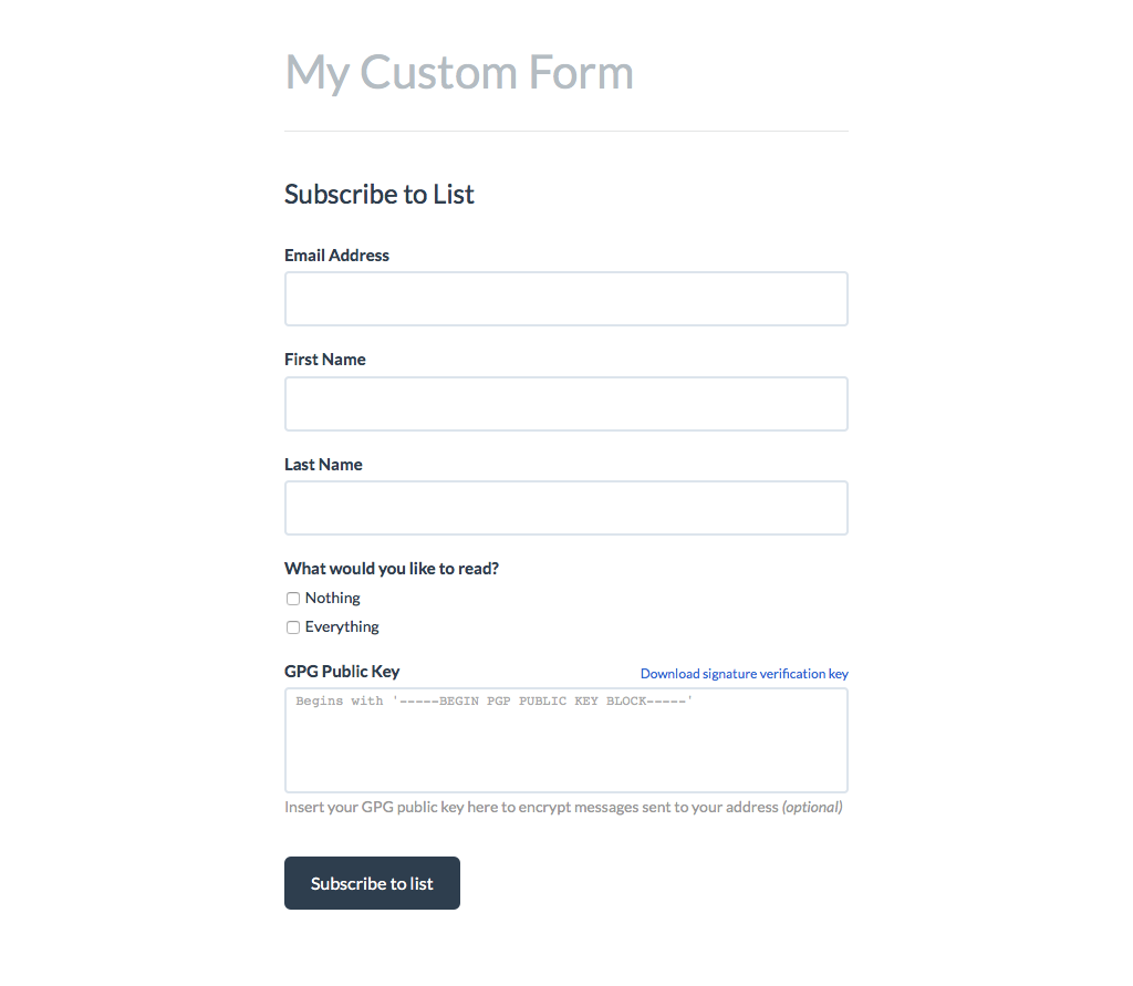 If a list has a custom field for a GPG Public Key set then subscribers can upload their GPG public key to receive encrypted messages from the list.