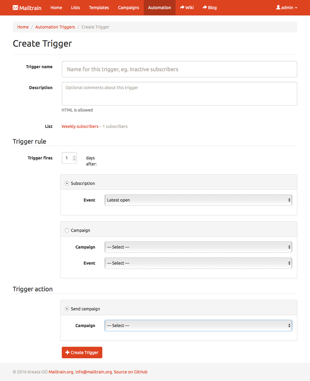 Setup Mailtrain to track RSS feeds and if a new entry is detected in a feed then Mailtrain auto-generates a new campaign using entry data as message contents and sends it to selected subscribers.