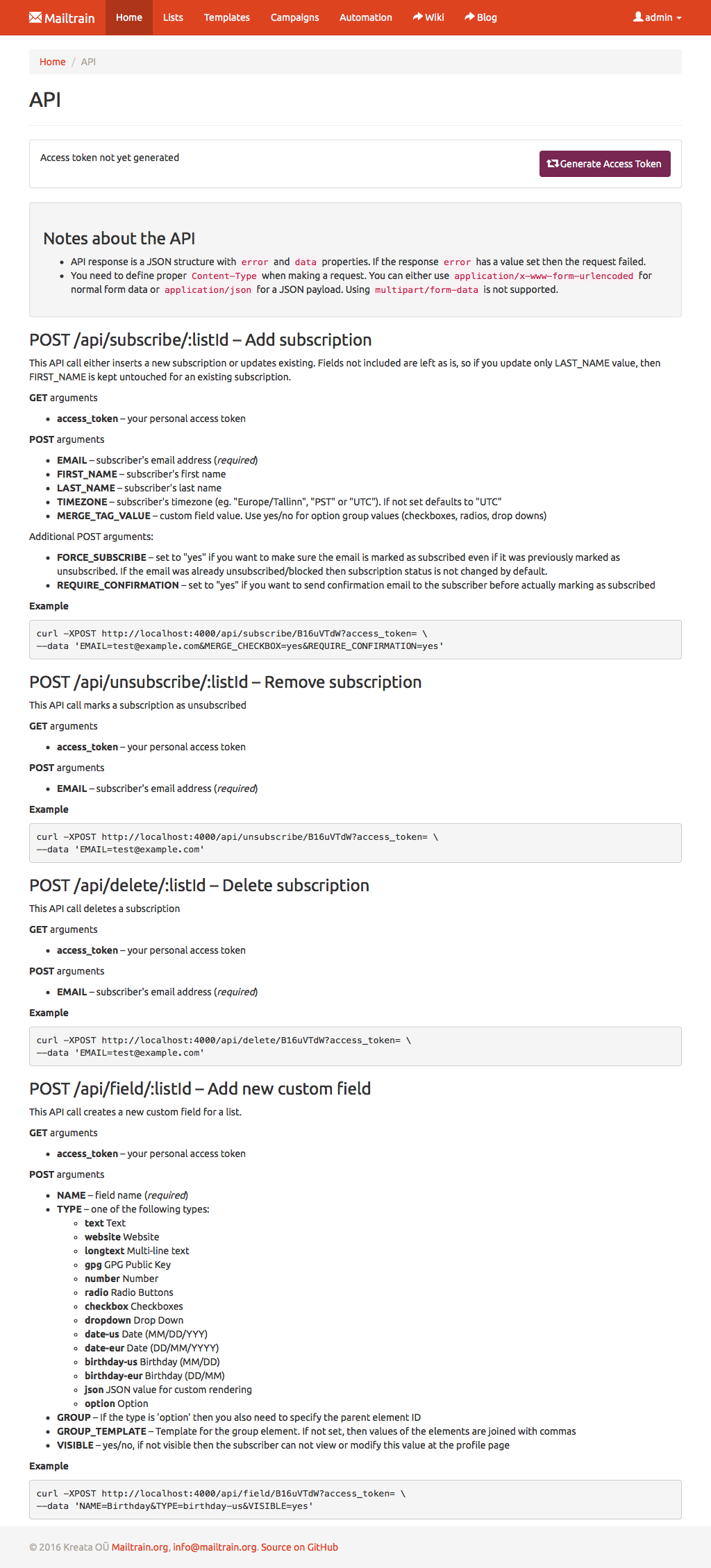 Text fields, numbers, drop downs or checkboxes, Mailtrain has them all. Every custom field can be included in the generated newsletters through merge tags. Mailtrain also supports custom forms.